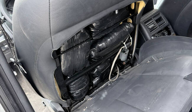 El automotor con placas de circulación del estado de California, Estados Unidos de América, tenía una tapa de plástico en el respaldo del asiento del copiloto, que ocultaba 9 paquetes con una sustancia cristalina, similar a la metanfetamina.